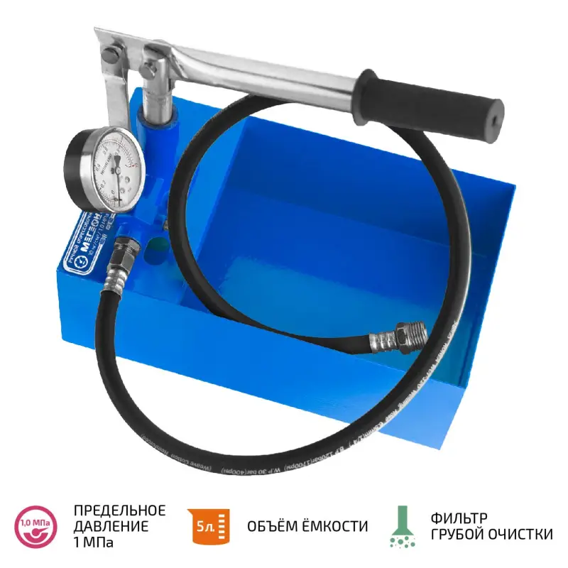 Ручной опрессовочный насос МЕГЕОН 98010 разработан специально для применения в частных домах, на дачах и других системах с давлением не более 10 Бар. Модель оборудована манометром до 10 Бар, что позволяет точно произвести диагностику и выявить неисправность. МЕГЕОН 98010 — это ручной инструмент для гидроиспытаний ёмкостей, проверки герметичности магистралей, трубопроводов, водопровода, сантехники, систем пожаротушения и отопления, технологического оборудования, паровых котлов и многих других применений, идеален для добавления рабочей среды в закрытые контуры. Насос закреплен на сварном баке, изготовленном из листовой стали с покрытием, устойчивым к воздействию разнообразных жидкостей. На выходе установлен манометр, рассчитанный на 10 кгс/см2 (1 МПа), с хорошо читаемой шкалой для контроля создаваемого давления, клапан сброса по завершении работ и гибкий РВД для подсоединения к испытуемому объекту. Прочный шарнир рычага с длинной рукояткой обеспечивает точную передачу усилий на поршень при наименьшем износе. Фильтр грубой очистки для защиты от взвеси и крупных частиц.