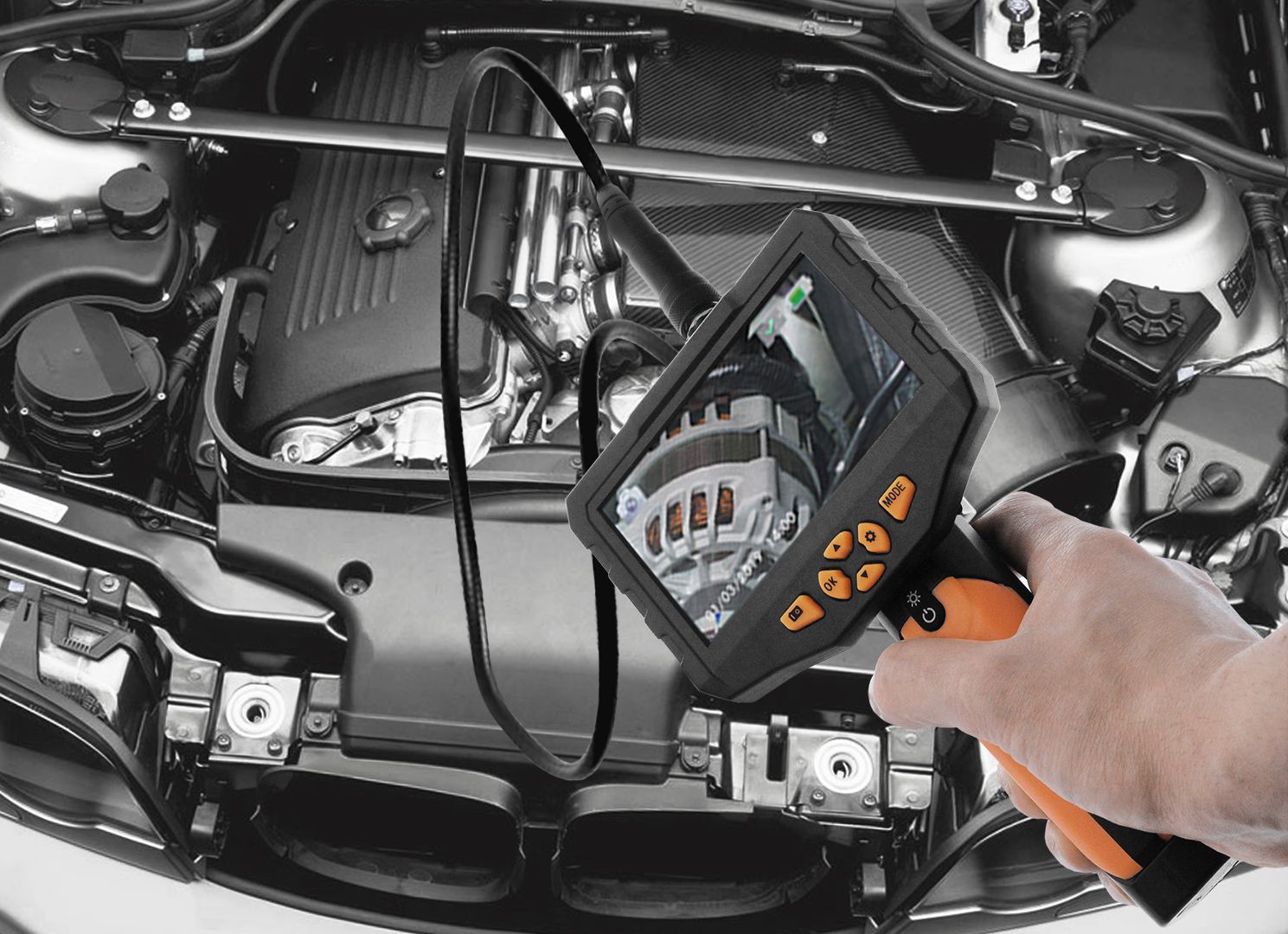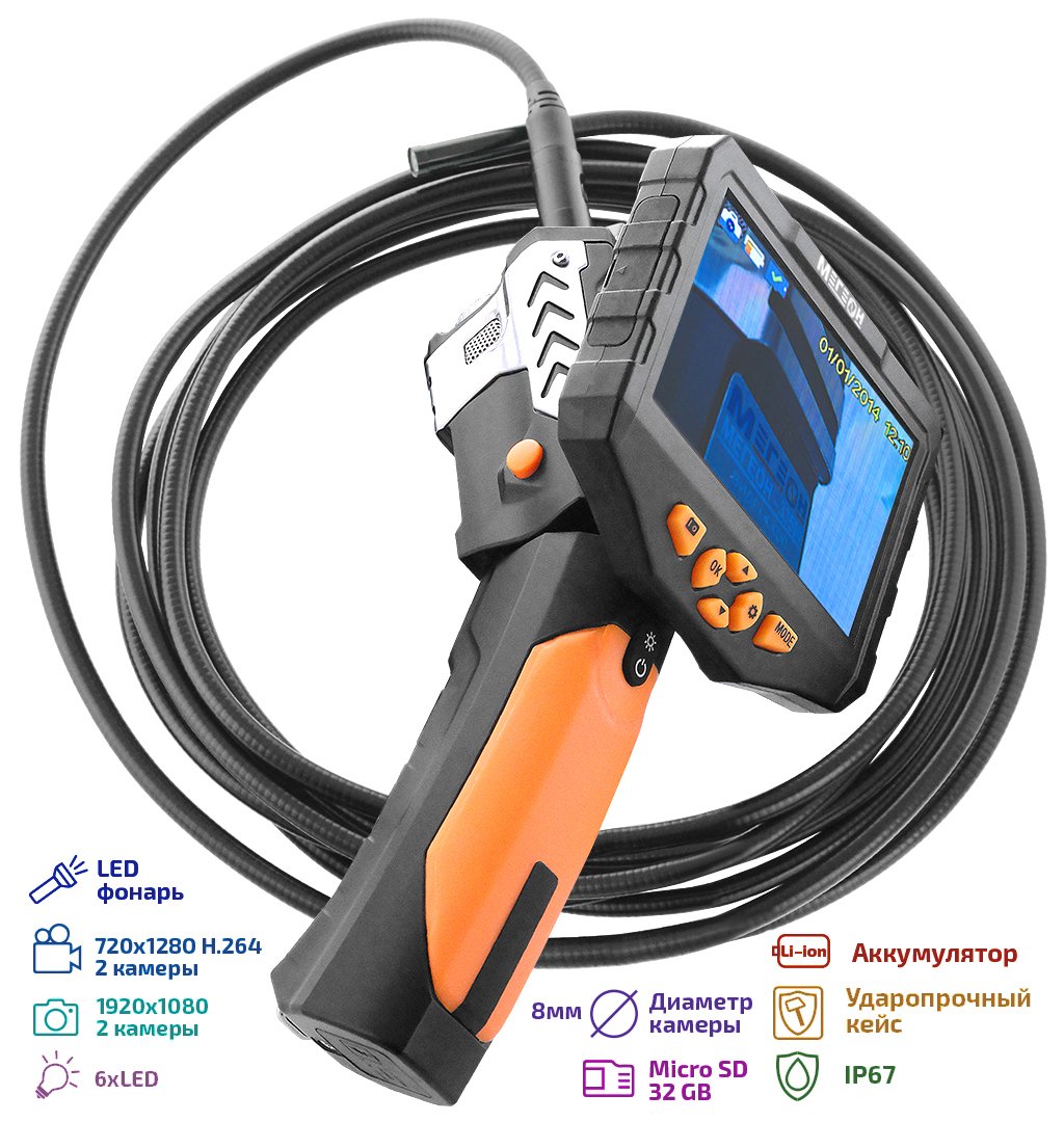 МЕГЕОН 33500- 58D - новинка в модельном ряду цифровых видеоскопов, предназначенный для решения задач в быту и промышленности. Эндоскоп представляет собой устройство для исследования и осмотра скрытых от глаза полостей с возможностью сохранения видеоизображения со звуком на встроенный носитель SDHC 32Гб. Помимо этого предусмотрено получение цветных изображений с помощью фотографий. Зонд диаметром 6,9 мм и длиной 5 метров имеет полужёсткую конструкцию на конце которого поместились две перпендикулярно направленные камеры. Подсветки оснащены яркими светодиодами со ступенчатой регулировкой яркости, которые обеспечивают работу в условиях полного отсутствия освещения. Большой ЖК-дисплей с разрешением 854х 480 и диагональю 4,3' отчётливо отобразит всё происходящее перед объективом. Дополнительно в корпусе предусмотрена подсветка с высокой интенсивности свечения, которая с лёгкостью заменит фонарик. Преимущества изделия по достоинству смогут оценить профессионалы и любители.